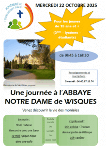 Les 3èmes et les lycéens sont invités à participer à une journée avec les moniales de Wisques pendant les vacances de Pâques. Renseignements : Gwenaël