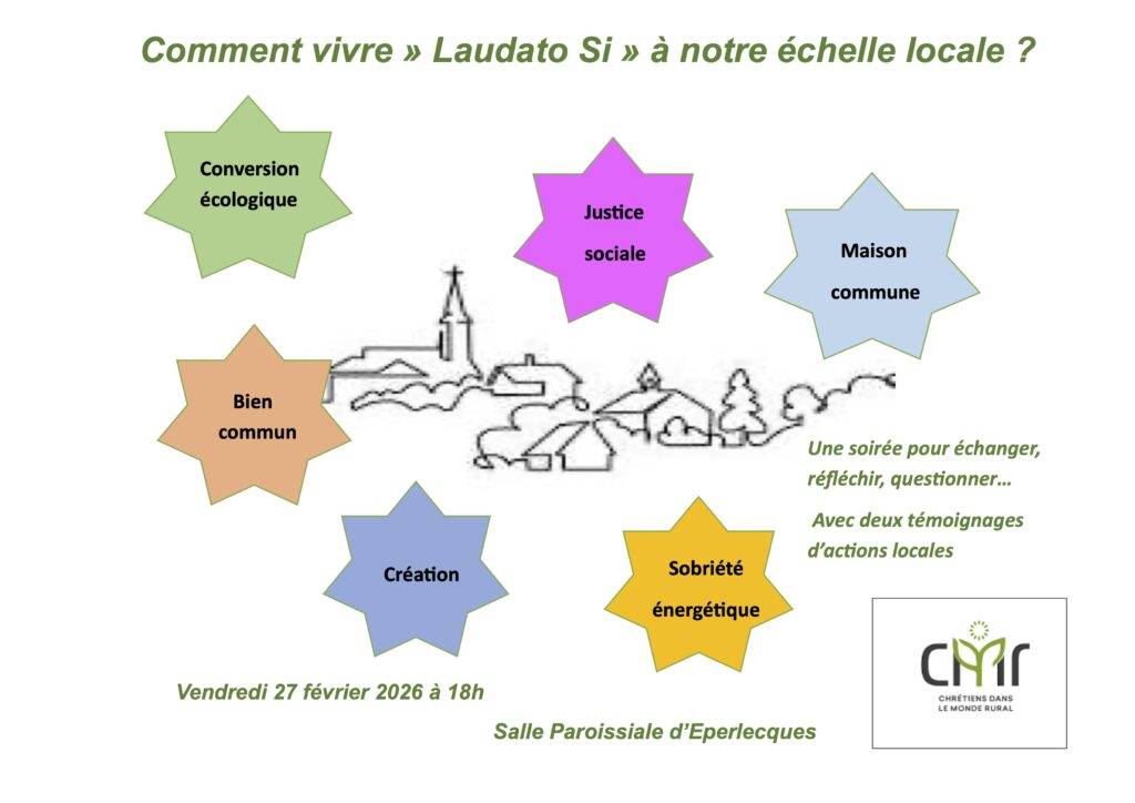 Le vendredi 27 février à 18h, le CMR et l’équipe de la paroisse d’Éperlecques proposent un temps d’échange et de réflexion sur la mise en pratique au niveau local de la pensée « Laudato Si » de pape François, sur la sauvegarde de la maison commune. Rendez-vous à la salle paroissiale d’Éperlecques rue de la Meulemotte pour […]